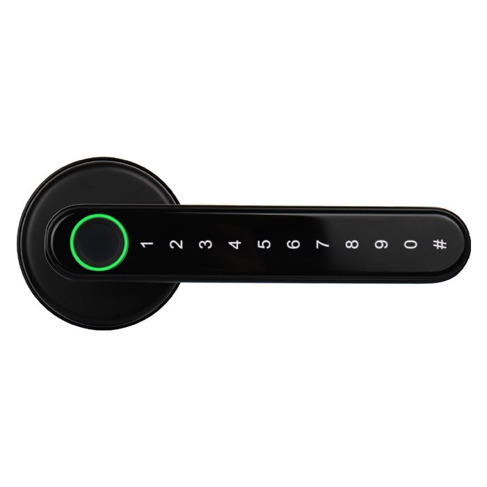 This smart lock offers fingerprint, digital PIN code, and mobile app access. It retrofits most residential and commercial knobsets and leversets and includes a 60–70mm adjustable latch. The fingerprint sensor is ergonomically positioned on the lever for natural thumb access. Note: Suitable for internal doors and external doors that are protected from the elements.