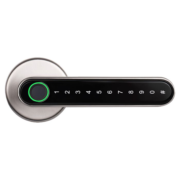 This smart lock offers fingerprint, digital PIN code, and mobile app access. It retrofits most residential and commercial knobsets and leversets and includes a 60–70mm adjustable latch. The fingerprint sensor is ergonomically positioned on the lever for natural thumb access. Note: Suitable for internal doors and external doors that are protected from the elements.